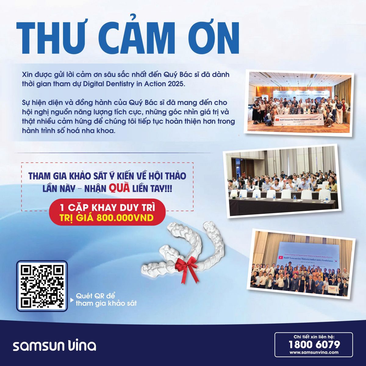 Nhờ sự đồng hành của các báo cáo viên và bác sĩ, Digital Dentistry in Action 2025 đã diễn ra thành công, mở ra nhiều cơ hội kết nối, học hỏi và cập nhật các giải pháp nha khoa kỹ thuật số hiện đại. Samsun Vina hy vọng sẽ tiếp tục đồng hành cùng quý bác sĩ trong những chương trình tiếp theo, mang lại nhiều giá trị mới cho cộng đồng nha khoa Việt Nam.